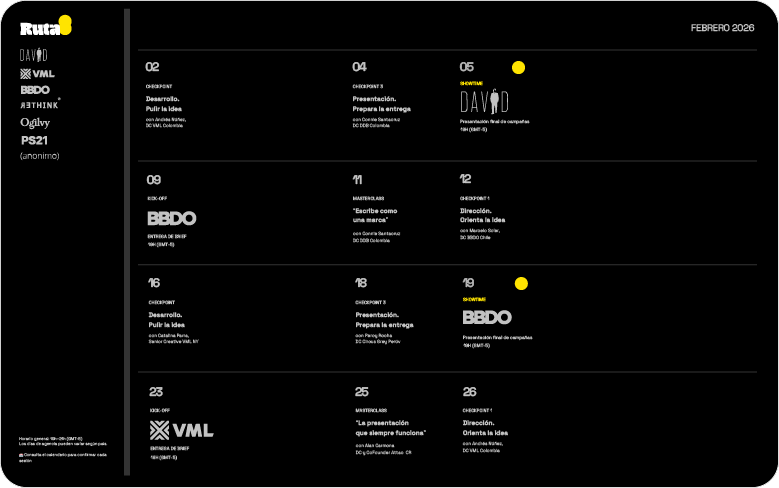 En Ruta8 no trabajamos con ejercicios. Trabajamos con briefs reales, los mismos que llegan a las mesas de las agencias más reconocidas del mundo. Cada etapa del circuito comienza con un reto auténtico, compartido directamente por los equipos creativos que hoy están marcando el rumbo de la industria.