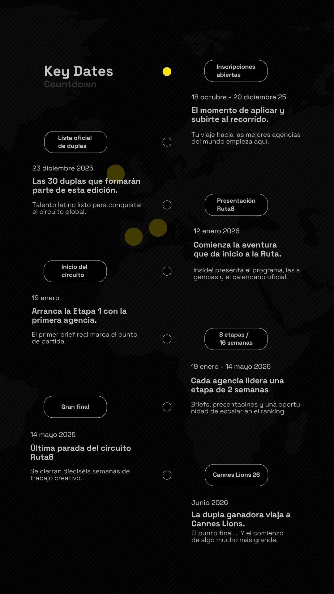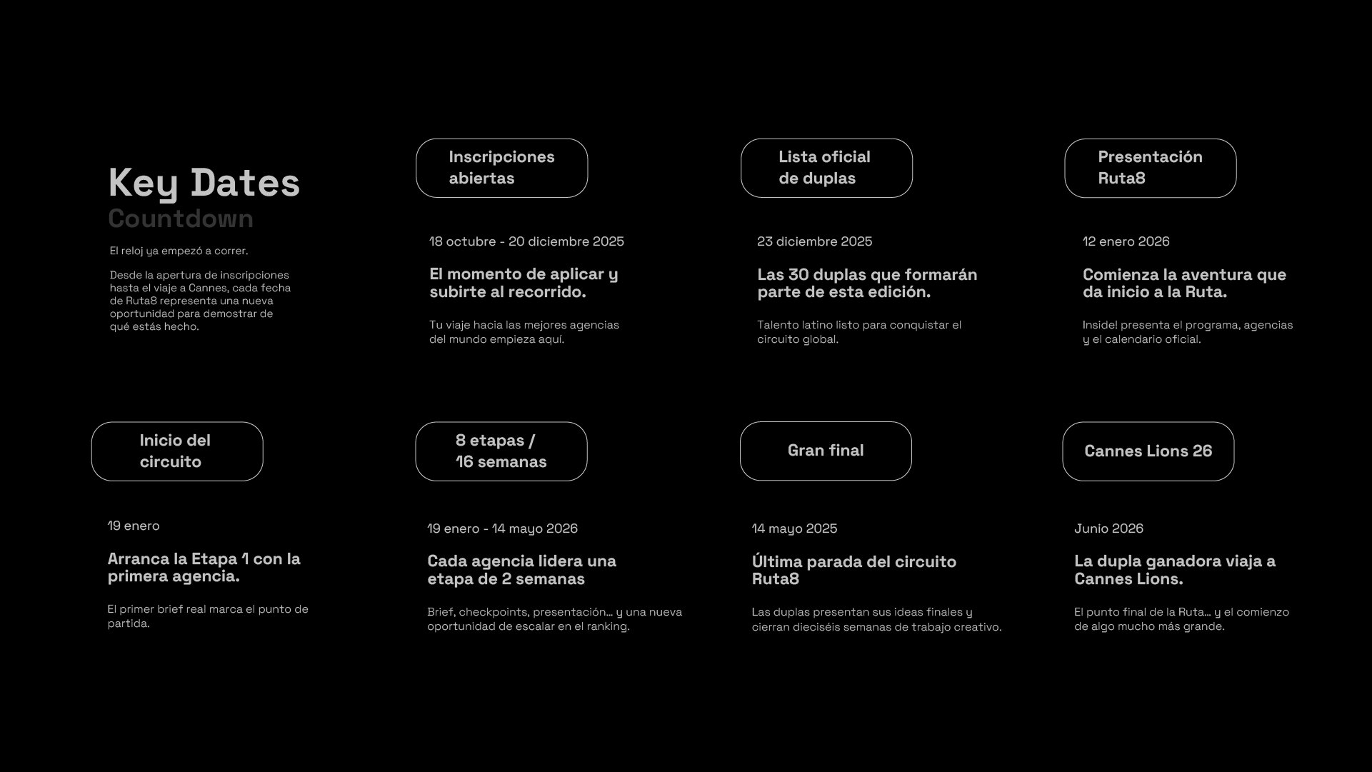Más que un programa, Ruta8 es un punto de encuentro entre las principales agencias del mundo y la nueva generación de talento latino, a través de briefs reales propuestos por las propias agencias.